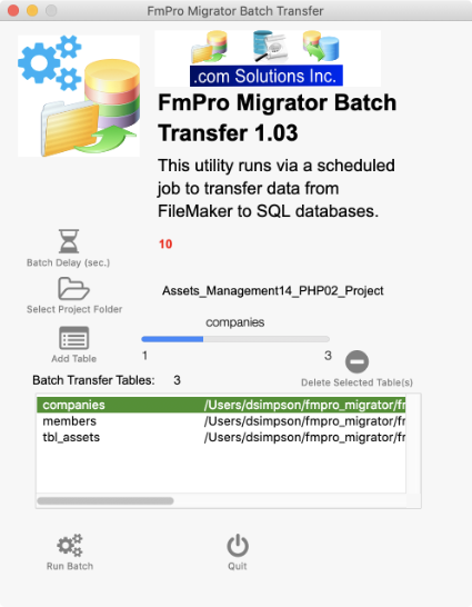 The FmPro Migrator Batch Transfer utility is included with FmPro Migrator Platinum Edition licenses. This new utility enables automated data transfers (data sync, mirroring of data) from FileMaker Server Server to SQL databases (MySQL, SQL Server, PostgreSQL, Oracle, SQLite). What it is: